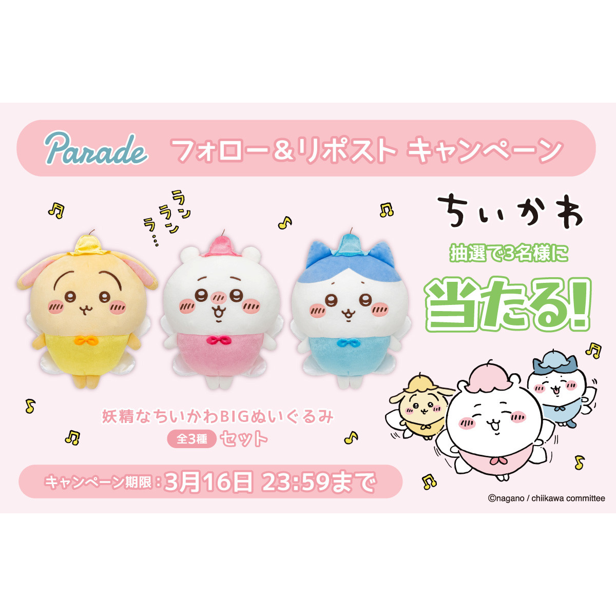 妖精なちいかわぬいぐるみセットが当たる! パレードがフォロー&リポスト キャンペーンを実施中!