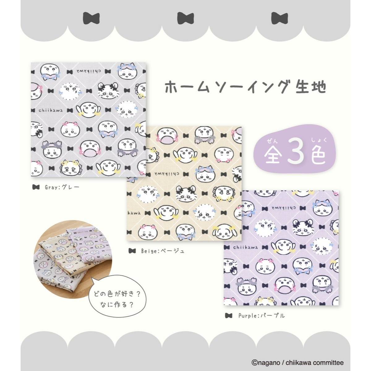 リボンをつけたちいかわたちのホームソーイング生地が登場!バッグや巾着などを作って楽しんで♪