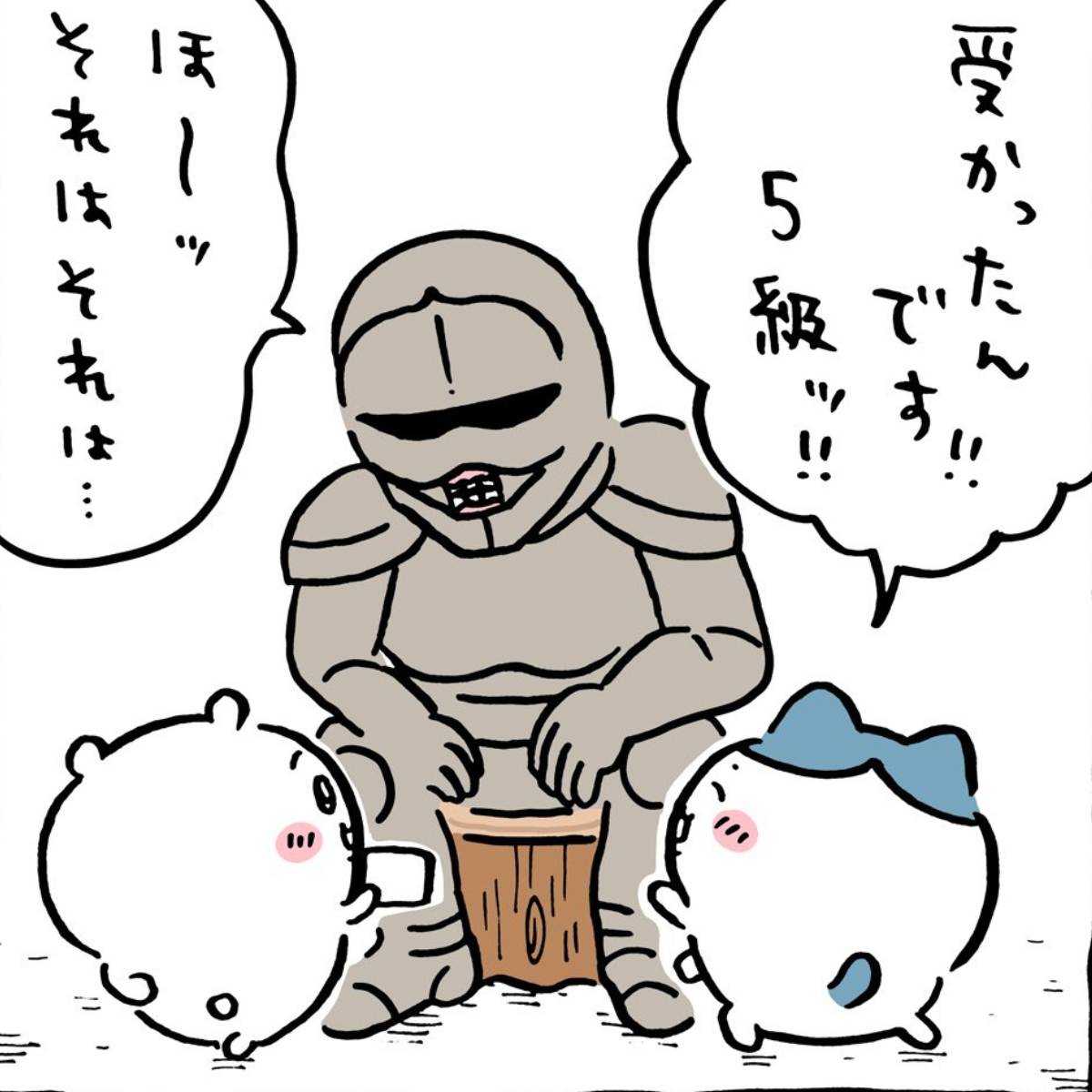 【ちいかわマンガ】5級合格を祝うポシェットの鎧さん!お菓子のたすきプレゼントにファンほっこり